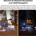 - ناوبری پیشرفته: با هوش مصنوعی واکنشی، دوربینهای RGB و نور ساختاریافته، تمیز کردن بدون برخورد را تجربه کنید و ۶۲ نوع شیء را تشخیص داده و از آنها اجتناب کنید. PreciSense LiDAR نقشههای بلادرنگ را برای مسیرهای بهینه تمیز کردن ایجاد میکند.